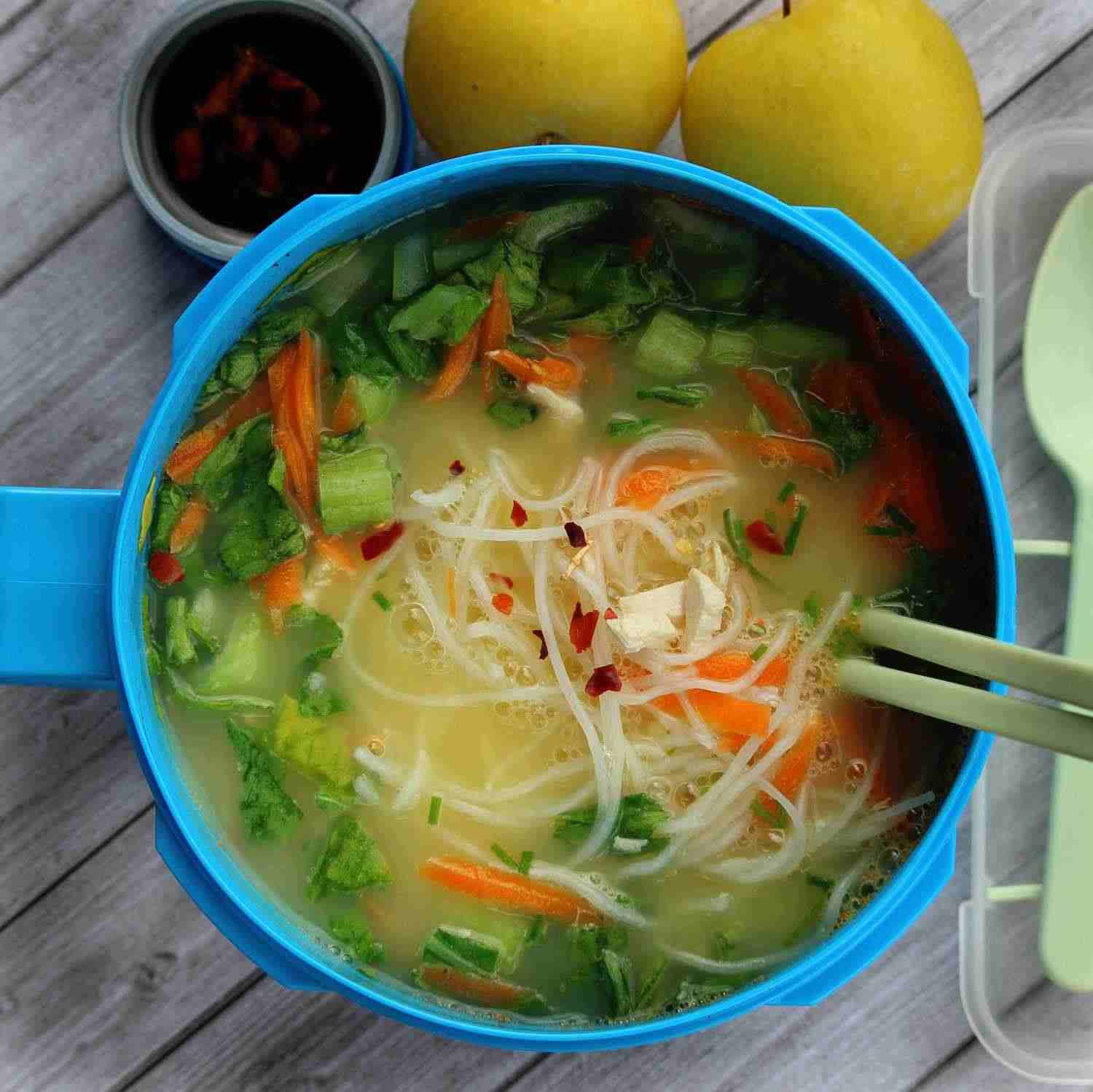 - Step 1:Combine rice noodles, chicken, bok choy, carrot, green onion, dashi, nutritional yeast, ginger, black pepper, white pepper, and red pepper flakes in a large, portable bowl with a lid.