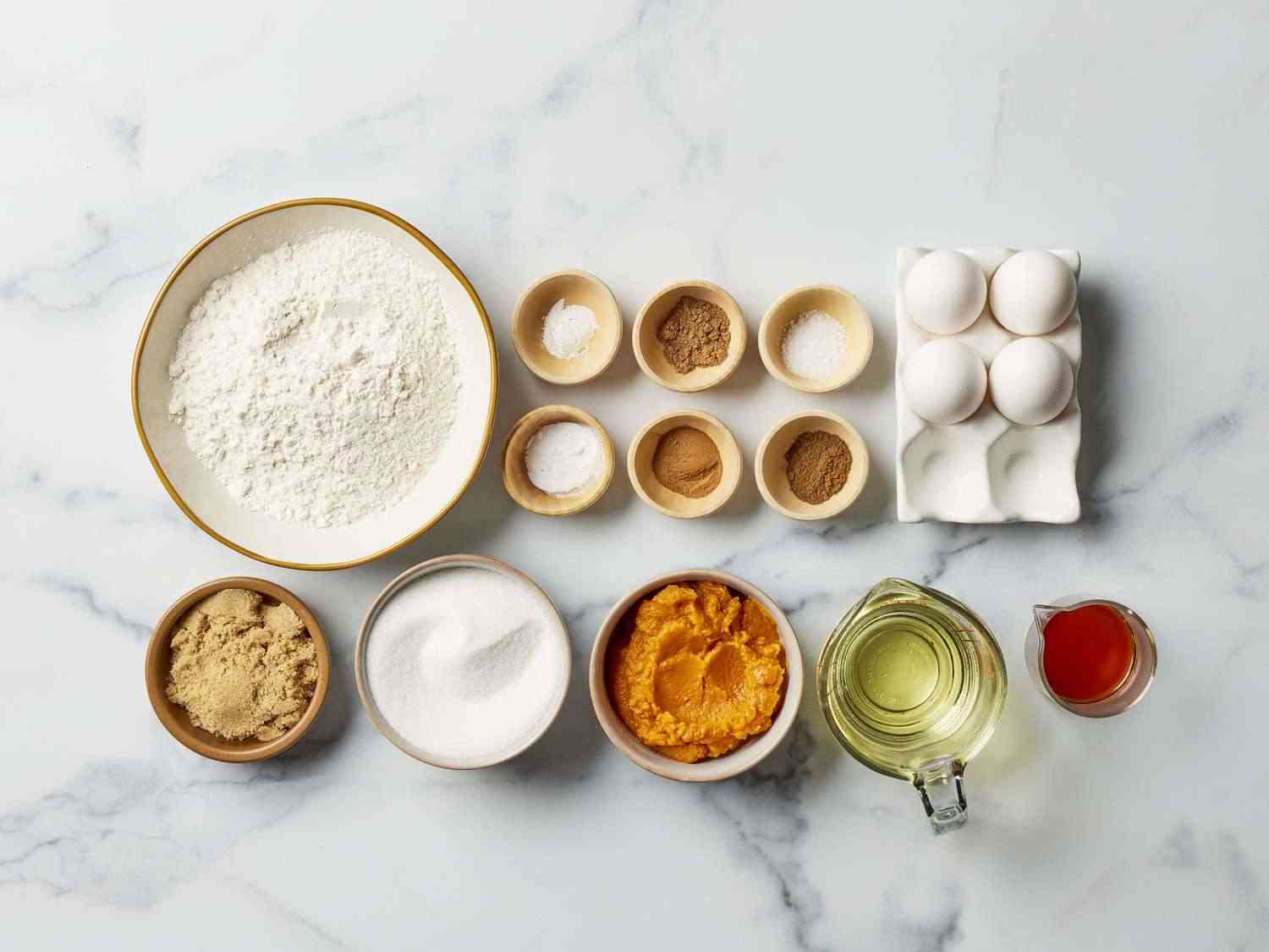 - Step 2:Combine flour, baking soda, nutmeg, cinnamon, cloves, baking powder, and salt in a large bowl; mix well and set aside. Beat eggs, white sugar, brown sugar, and vanilla extract in a large bowl with an electric mixer on high speed until combined, about 30 seconds. Beat in pumpkin and oil. Add flour mixture; mix until batter is blended and smooth. DOTDASH MEREDITH FOOD STUDIOS