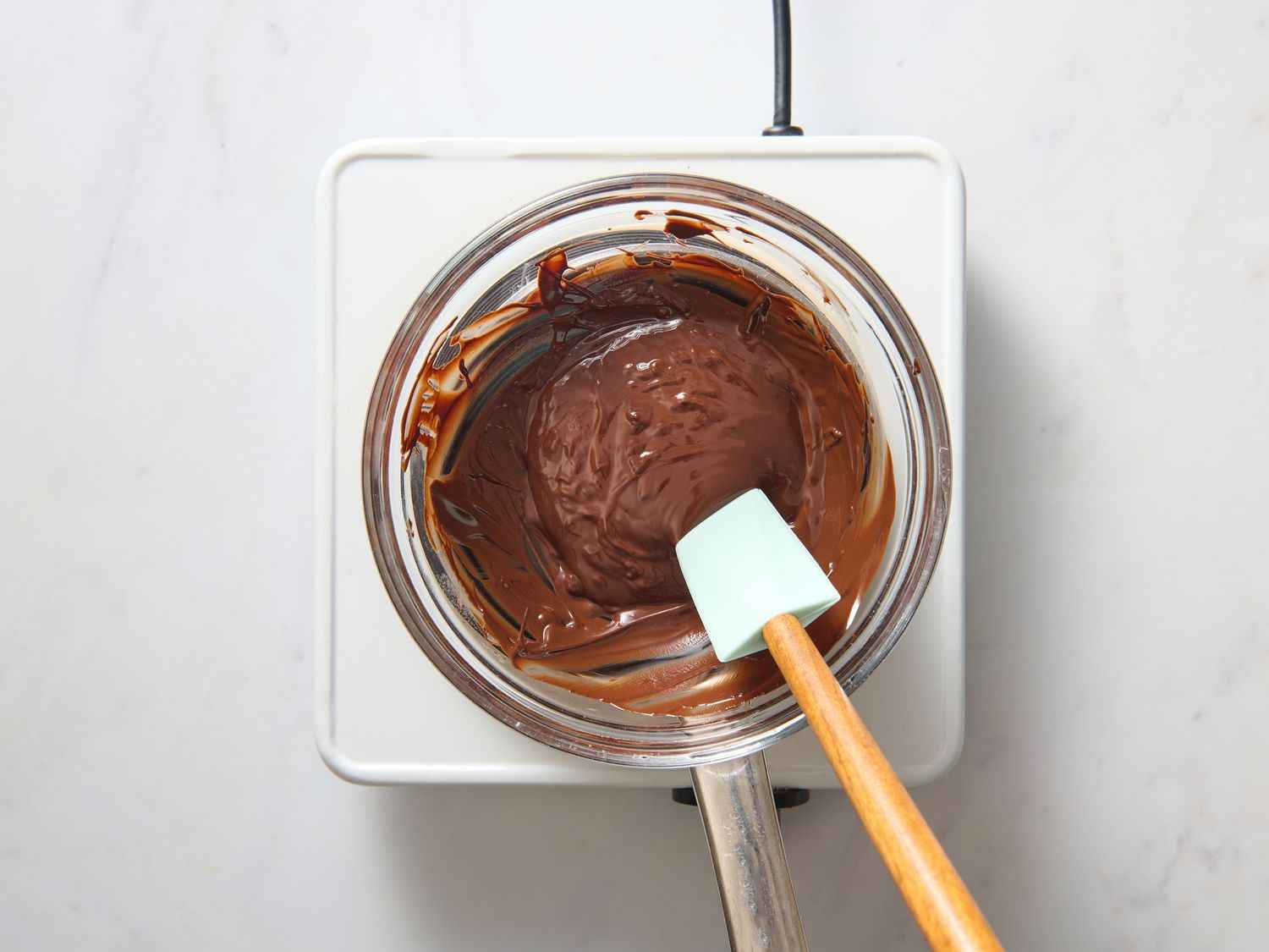 - Step 3:Melt chocolate in top of a double boiler over simmering water, stirring frequently and scraping down the sides with a rubber spatula to avoid scorching. Allrecipes/Julia Hartbeck